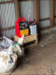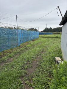 動物対策でぶどう園のサイドには暴風ネット、屋根には防鳥ネット、畑周りにはビリビリくる電気柵