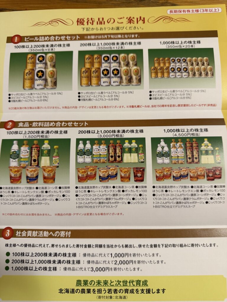サッポロビールからも優待品のご案内が来ていた、選べる優待品っていいよね、最近はビールだけど以前は「食品・飲料詰め合わせセット」だったかな?