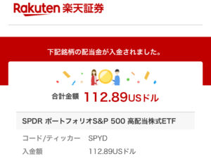 大人気 ⁈ の高配当株式ETF「SPDRポートフォリオS&P500高配当株式ETF」(SPYD)から不労所得の配当金が入金。