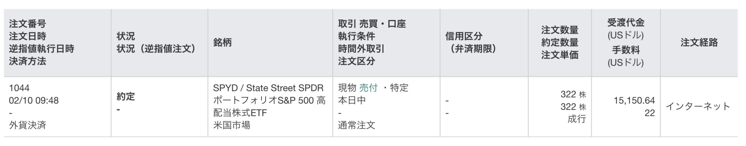 売りましたよ、SPYD322株、全部売ったのでSPYDは0株ですよ。
