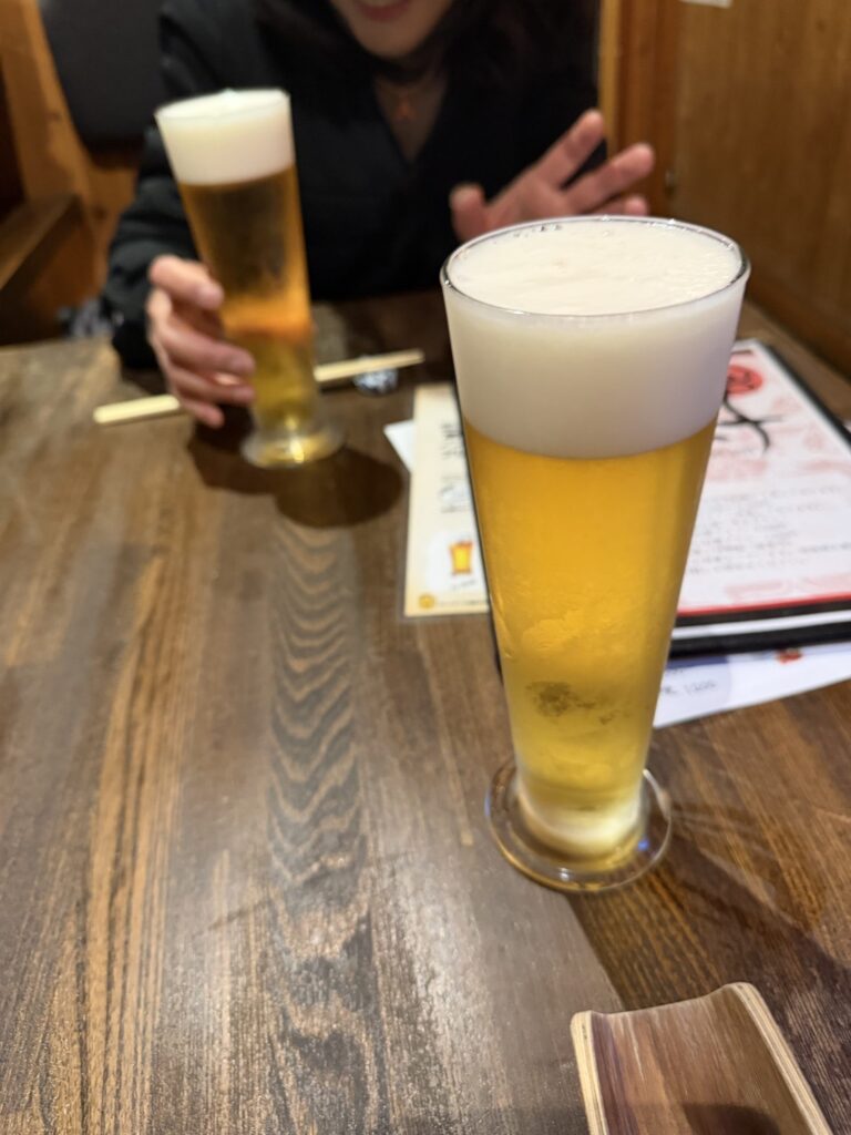 そんなこんなでお洒落な居酒屋で謎の美女?と、向かい合わせにお洒落なビアグラスでまずは乾杯。