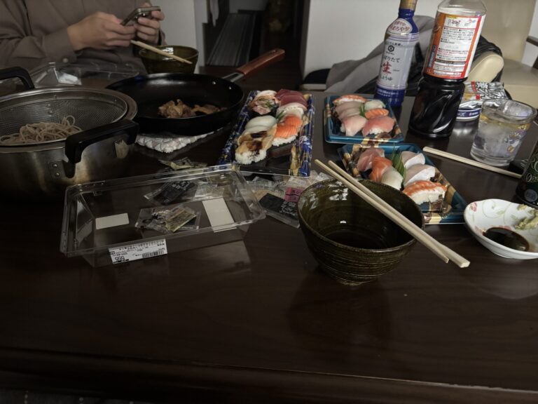 ざるそばをゆでながら… ざるそばにお寿司合うんだわ、んでビールでカンパ~イ。