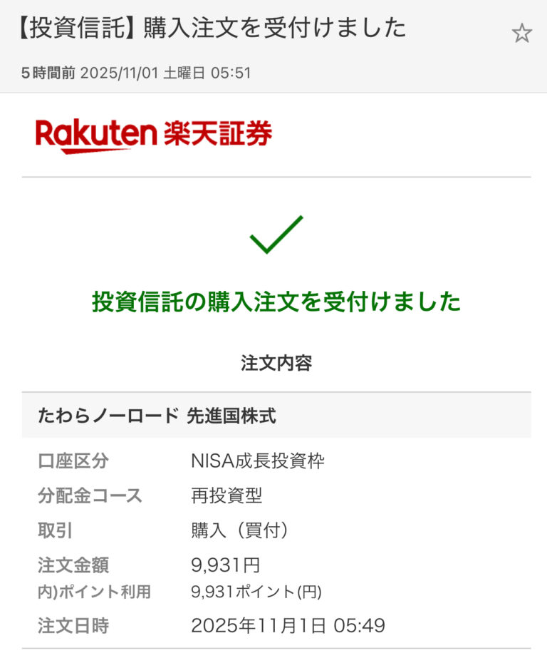 楽天のポイントが貯まったのでポイント運用「たわらノーロード先進国株式」に毎月コツコツ積み立て投資 今回は9,931ポイント