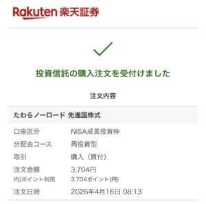 ということで今月も13日に楽天ポイント貰ったのでこれをいつも通り「たわらノーロード先進国株式」にぶち込んだとさ(知るか!)