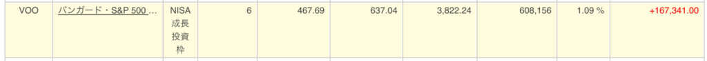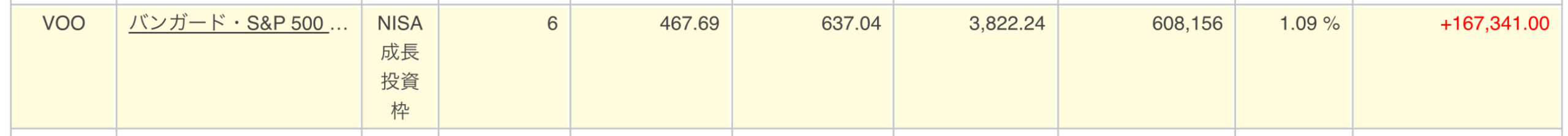 一年半前にそのVOOを当時6株、44万円をぶち込んで現在の含み益は+167,000円にまで成長しておりトータル60万円へと右肩上がり。